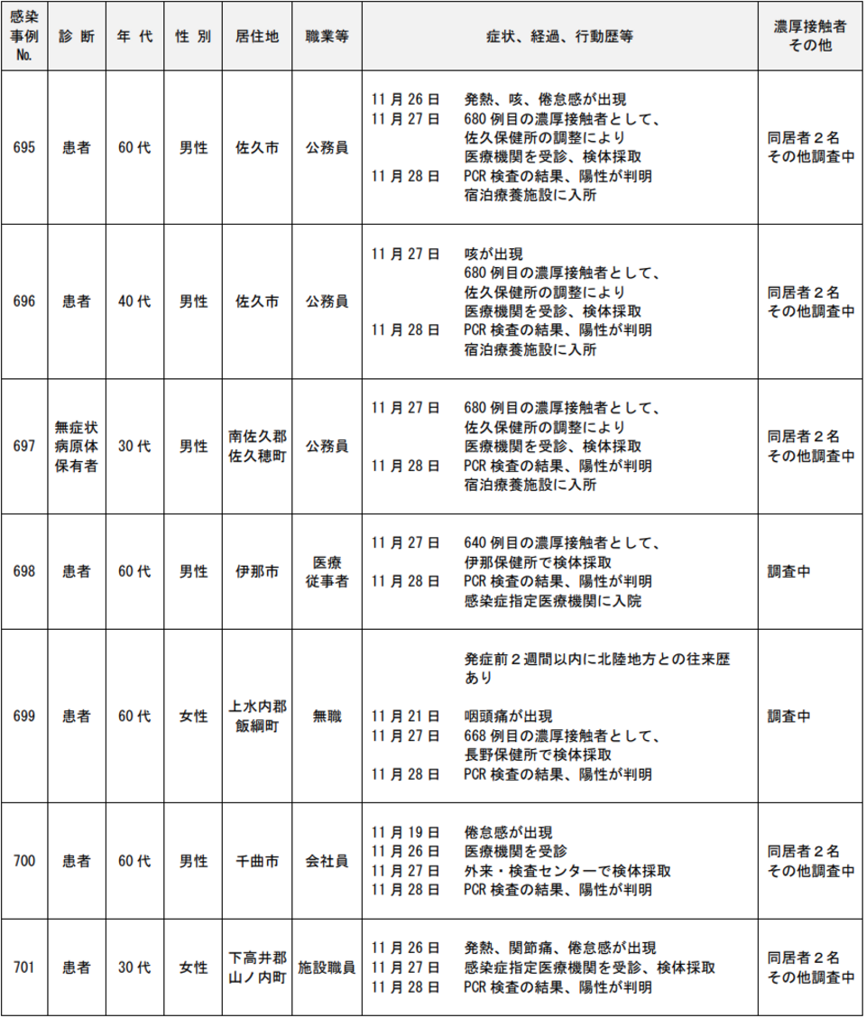 <11/29>長野県内において新型コロナウイルス感染症の陽性者(患者等)が9例確認(695~703例目)。県内陽性者(患者590例、無症状病原体保有者113例)。