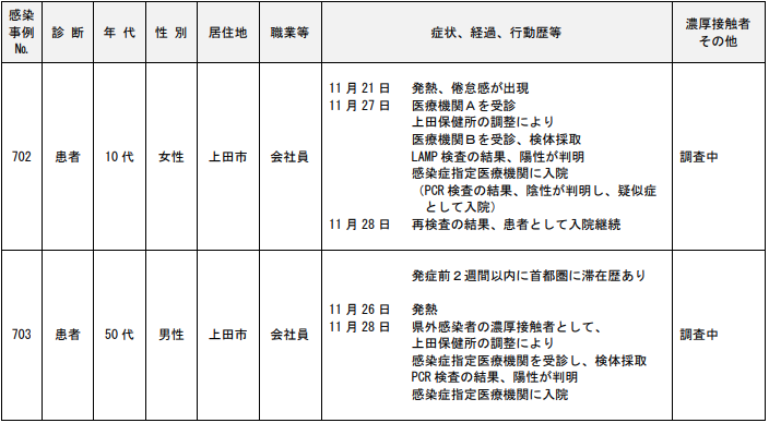 年代は70代の女性で居住地は岡谷市、職業等は自営業。症状、経過、行動歴等は発症前2週間以内に首都圏に滞在歴あり。11月28日に702例目の濃厚接触者として諏訪保健所の調整により、感染症指定医療機関を受診、検体採取。11月29日にPCR検査の結果、陽性が判明。咳が出現、感染症指定医療機関に入院した。濃厚接触者は調査中だ。