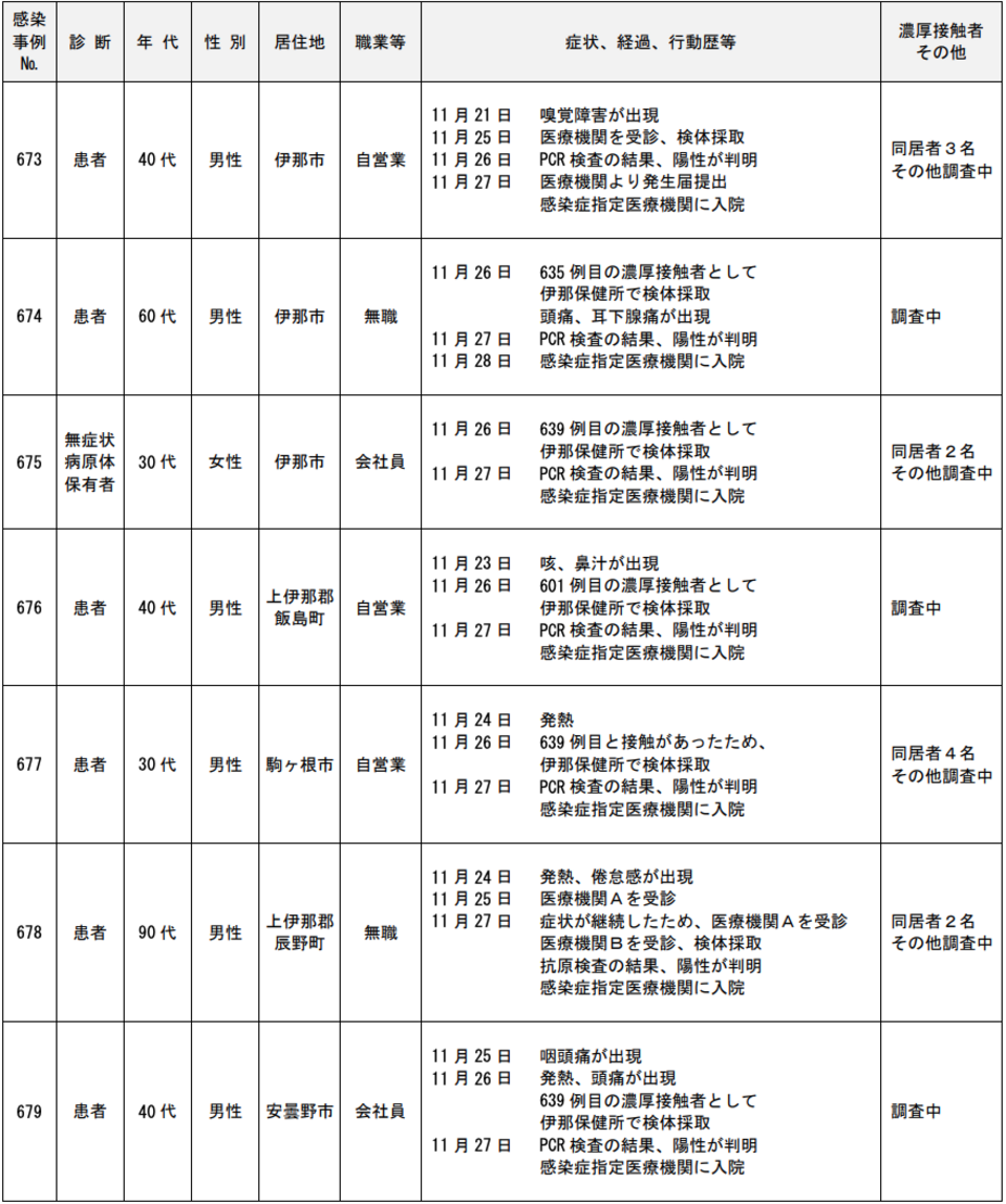 年代は40代の男性で居住地は伊那市、職業等は会社員。症状、経過、行動歴等は11月25日に 嗅覚•味覚障害、鼻閉が出現。11月27日に673例目との濃厚接触があったため伊那保健所に相談伊那保健所の調整により外来•検査センターで検体採取。11月29日にPCR検査の結果、陽性が判明。感染症指定医療機関に入院した。濃厚接触者は同居者3名、その他調査中。