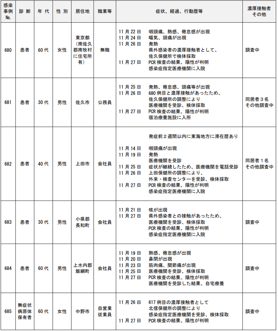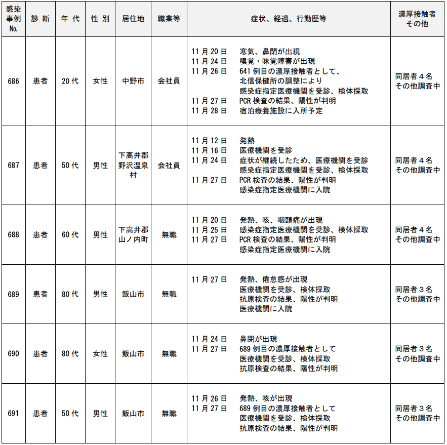 年代は10代の男性で居住地は飯山市、職業等は高校生。症状、経過、行動歴等は11月28日に 689例目の濃厚接触者として、北信保健所の調整により感染症指定医療機関を受診、検体採取。11月29日にPCR検査の結果、陽性が判明。医療機関に入院した。濃厚接触者は同居者2名、その他調査中。