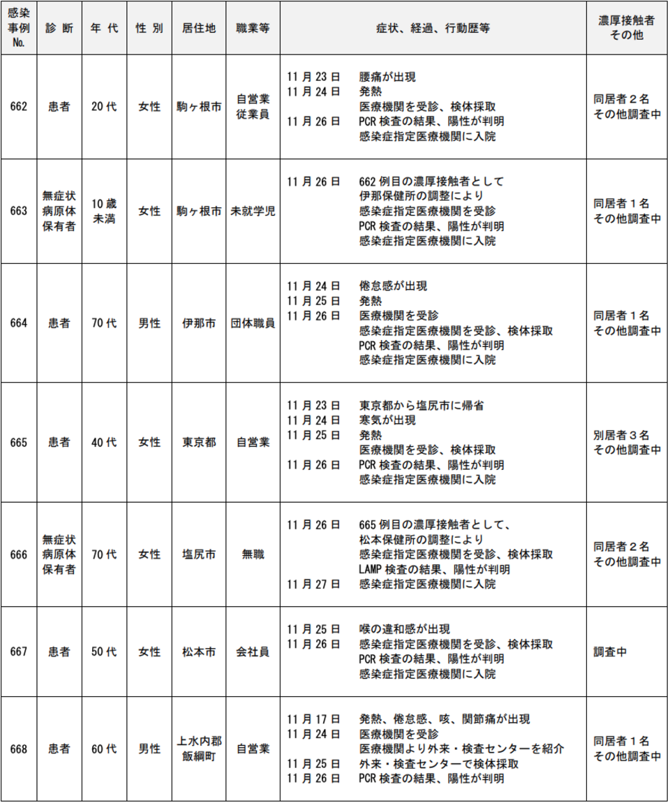 <11/27>長野県内において新型コロナウイルス感染症の陽性者(患者等)が9例確認(662~670例目)。県内陽性者(患者562例、無症状病原体保有者108例)。