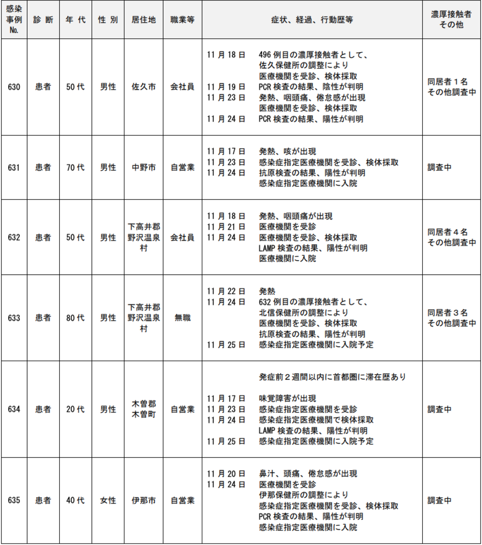 <11/25>長野県内において新型コロナウイルス感染症の感染者(患者等)が6例確認(630~635例目)。県内感染者(患者534例、無症状病原体保有者101例)。