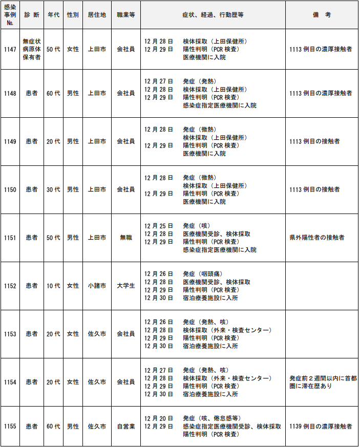年代は20代の男性で居住地は上田市、職業等は会社員。症状、経過、行動歴等は12月26日に 発症(微熱)。12月30日に検体採取(上田保健所)。12月31日に陽性判明(PCR検査)、宿泊療養施設に入所した。1151例目の濃厚接触者。