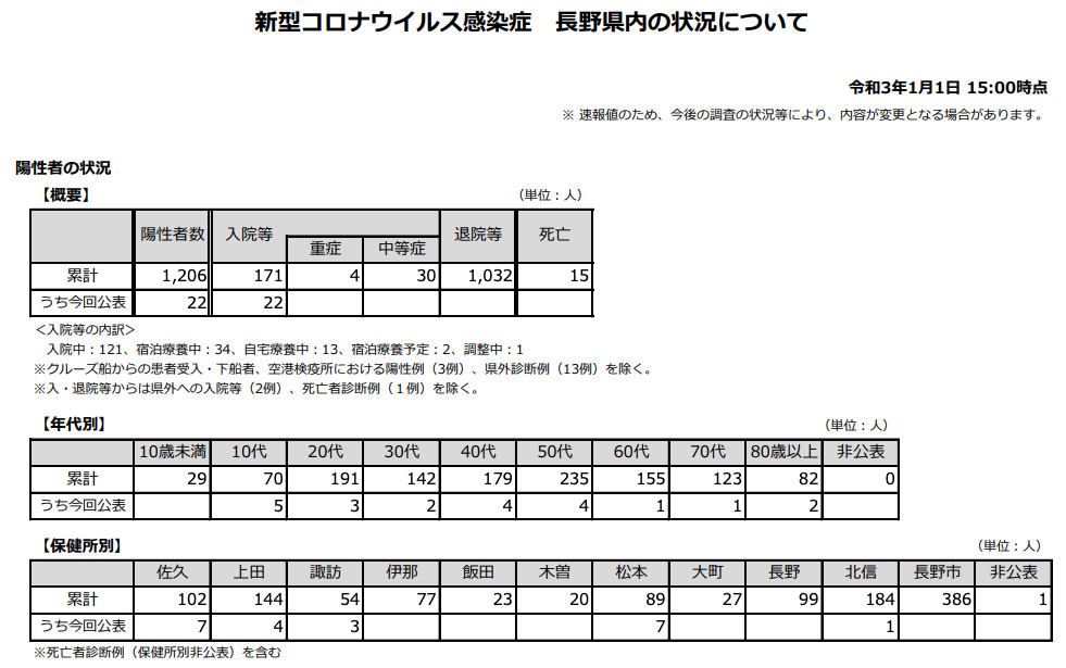 新型コロナウイルス感染症長野県内の状況について(令和3年1月1日 15:00時点)