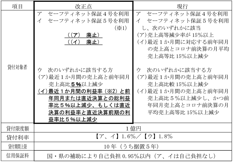 長期化する新型コロナウイルス感染症等の影響により増大した借入金の返済負担軽減等のため経営健全化支援資金(新型コロナ向け伴走支援型)の要件緩和を行う。取扱開始日は令和5年1月10日申込分からだ。