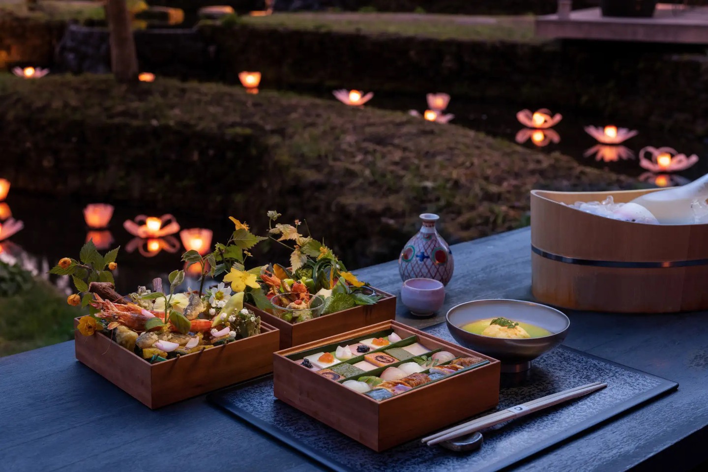 メインとなるのは、滋味深い旬の山菜や川魚を堪能できる三段重。またこの時期、星のや軽井沢を象徴するランドスケープである棚田には約300個の花行燈が灯り、幻想的な空間を演出する「軽井沢 花の宴」が開催される。花行燈の灯る棚田を目の前に望む特等席で、限定販売の特別なロゼシャンパーニュと共に、華やかな食体験を楽しめる。