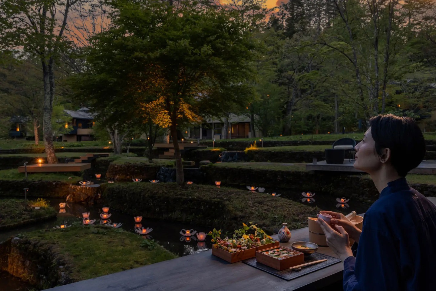 各施設が独創的なテーマで圧倒的非日常を提供する「星のや」。その始まりの地である軽井沢の「星のや軽井沢」では3月1日~4月26日の期間、幻想的な棚田の情景を望む特等席で、ロゼシャンパーニュと共に特別夕食を味わう「花の宴夕食膳」を提供する。