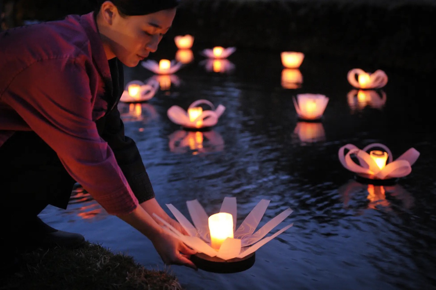 花行燈は、春になると星のや軽井沢の敷地内に咲く花「フクジュウソウ」「ルリソウ」「アズマイチゲ」をモチーフにしたこの季節だけの特別装飾だ。まるで水面に花が咲いているかのように浮かぶ花行燈と、心温まる火の揺らぎが幻想的な空間を創り出す、星のや軽井沢だけの花見の食体験を楽しめる。