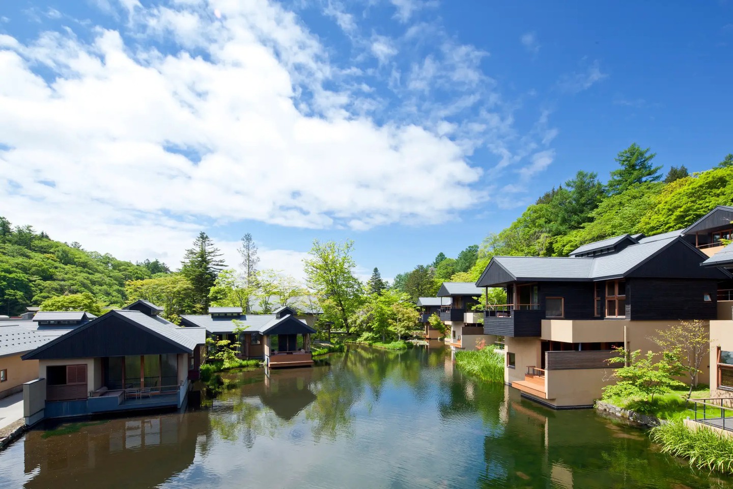 ⾕の集落に滞在する。離れの客室は⽔辺を囲み、部屋のテラスからは季節のうつろいが感じられる。「軽井沢野⿃の森」に⾯した豊かな⾃然環境にて、休息の時間を満喫できる滞在型の宿泊施設だ。
