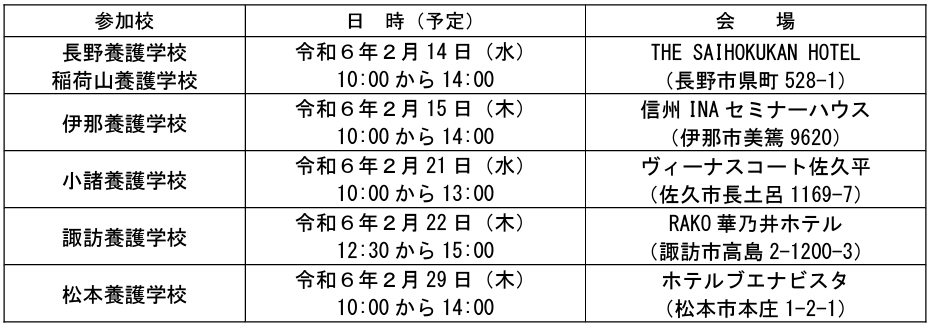 ヴィーナスコート佐久平、(株)アルピコホテルズホテルブエナビスタ、(株)サンティアRAKO華乃井ホテル、(株)セラヴィリゾート泉郷ホテルアンビエント安曇野、(株)長野ホテル犀北館、信州INAセミナーハウス、和菜燈花(五十音順)