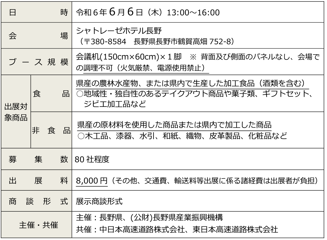 長野県及び(公財)長野県産業振興機構では、県内食品加工企業等の販路拡大と県産品の消費拡大を図るため、県内を中心とした高速道路のサービスエリア、 パーキングエリアにおける事業展開を希望する事業者を対象とした商談会を開催する。多くの皆様の参加をお待ちしている。