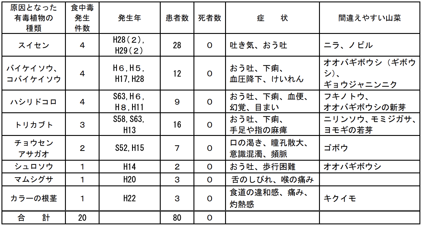 県内の有毒植物による食中毒は、昭和51年から令和5年までの間に20件(患者数80名)発生している。その内訳は下表のとおりとなっており、いずれも食べられる山菜だと思い、これらの有毒植物を食べたことにより発生している。