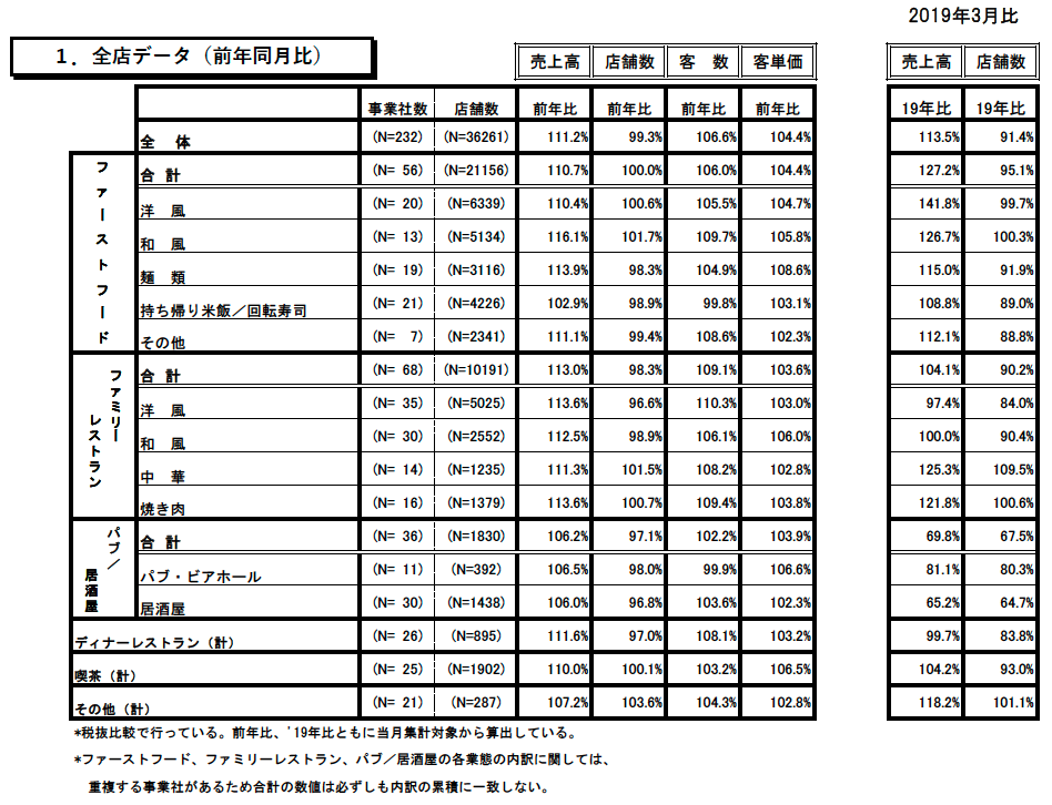 一般社団法人日本フードサービス協会(東京都港区、近藤正樹会長)は協会会員社を対象とした外食産業市場動向調査2024年3月度の集計結果をまとめた。「外食産業市場動向調査」は新規店も含めた「全店データ」を業界全体及び業態別に集計し、従来の前年同月比に加えて2019年同月比も算出し掲載している。