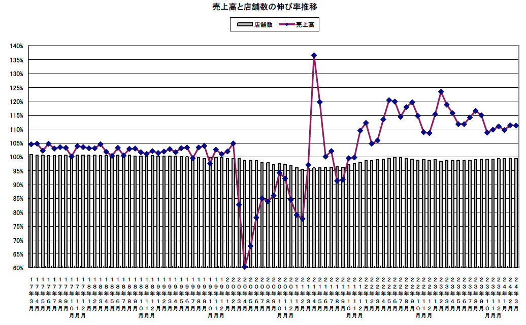「持ち帰り米飯/回転寿司」は、桜の開花が先送りとなり持ち帰り需要が伸び悩んだところもあったが、回転寿司は比較的堅調で、売上げは102.9%となった。「その他」は「カレー」のテイクアウトの価格改定で客単価が上昇、売上げは111.1%となった。