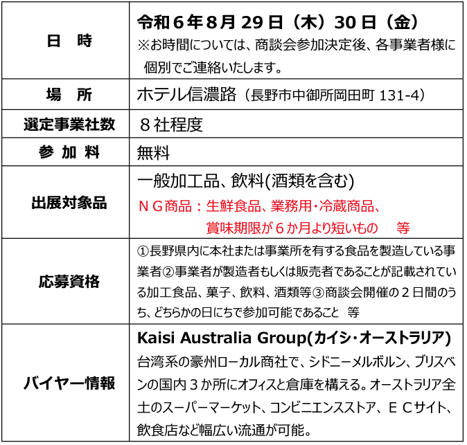 日本食材の需要拡大が見込まれ、有望な市場であるオーストラリアの食品バイヤーを招へいし、長野市内で個別商談会を開催する。オーストラリアへの販路開拓を希望する事業者の方は、是非ご応募下さい。