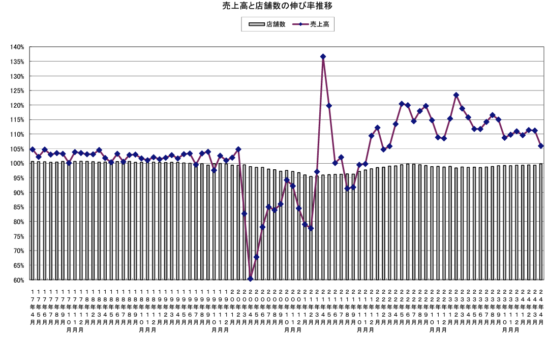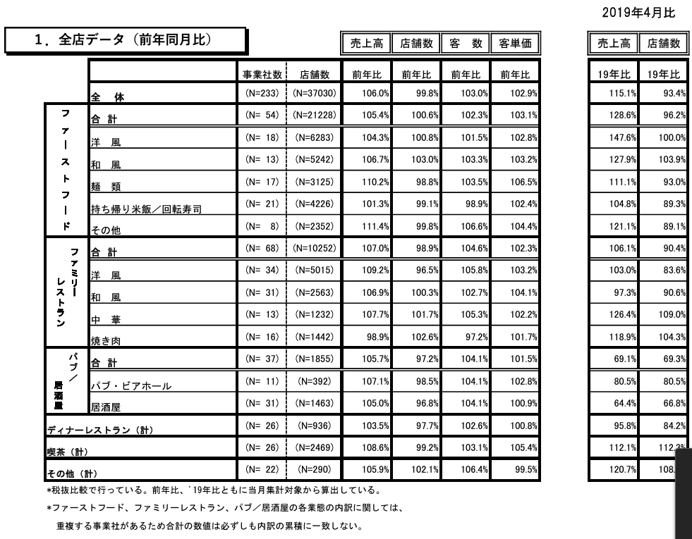4月の全体概況は全国的に桜の開花が遅れたことで花見需要が昨年より増え、また春の歓送迎会の後押しもあり、外食全体の売上げは前年比106.0%、19年比115.1%となった。全国各地では国内外からの観光客の消費が活発であったが、コロナ禍が明けて一年近くが経つ現在、物価高騰が続き、低価格重視の消費志向が高まる傾向にあり、利益を伴う売上増はおおむね前年ほどではない 。