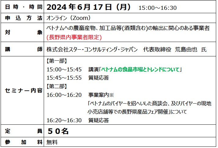 日本食材の需要拡大が見込まれ、有望な市場であるベトナム。8月には食品バイヤーを招へいし、長野市内で個別商談会の開催を予定している。商談会開催の前にベトナムの食品市場について知っていただくためのオンラインセミナーを開催する。ベトナムへの販路開拓を希望する事業者の方は、是非ご応募下さいと呼びかけている。