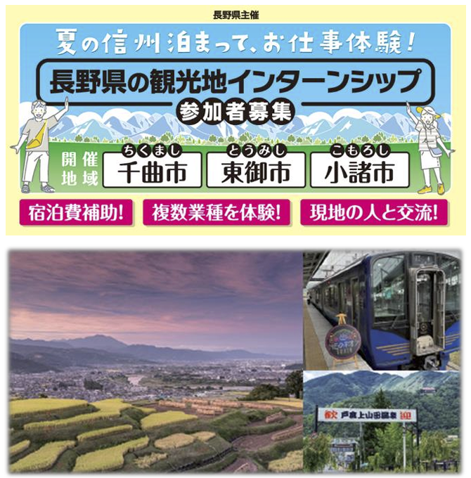 県は「観光地域パッケージ型インターンシップ促進事業」で本インターンシップを支援している。今年度の支援対象地域…千曲市・東御市・小諸市。東御市、小諸市のインターンシップの情報は詳細決定次第、ご案内する。