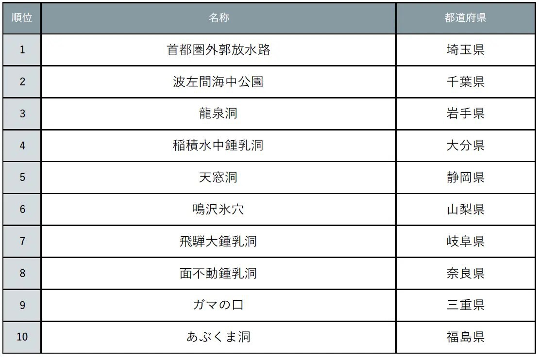 “地底で出合える異世界絶景”1位は埼玉県「首都圏外郭放水路」が獲得した。まるで“地下神殿”といわれる神秘的な雰囲気と、地下とは思えない壮大な光景が広がる。2位には千葉県「波佐間海中公園」がランクイン。水深16mからそびえたつ迫力の鳥居があり、人懐っこいコブダイやマンボウと一緒に泳ぐことができるスポットだ。