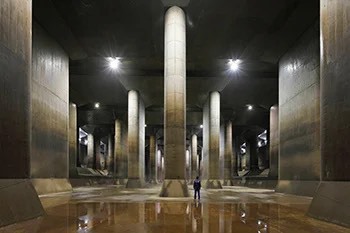 神秘的な雰囲気から“まるで地下神殿”といわれる「調圧水槽」は、国土交通省が管理する洪水対策のための地下放水路。そのほか、数々のロケ地としても使用された施設内では、圧倒的な迫力の巨大竪穴「第一立坑」やポンプ室など全4コースの見学会(要予約)を実施している。地下とは思えない巨大な柱と、広大な空間が織りなす荘厳な佇まいを体感できる。