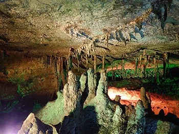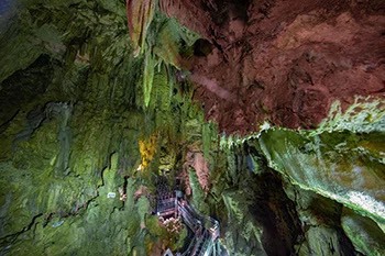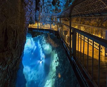 総延長は判明しているところで4,088m、発見された地底湖は8つ、現在も調査継続中という日本有数の鍾乳洞。長い時間をかけて生まれた芸術品のような鍾乳石が広がる。一番の見どころは水の透明度の高さから“ドラゴンブルー”と称され深い青色に輝く地底湖。約270段の階段を進んで「第一地底湖展望台」まで行くと、地底湖を上からのぞき込むことができる。