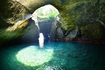 堂ヶ島にある白い凝灰岩にできた海蝕トンネル。遊覧船で入り天井が丸く抜け落ちた天窓まで進むと、暗い洞窟の中に光が差し込み、水面がブルーやグリーンの美しい色彩を放つ。天窓洞の上には堂ヶ島公園内の遊歩道があり、天窓の下を通る遊覧船を真上から見ることもできる。春から秋のお昼前後が特にきれいに見えるのでおすすめだ。