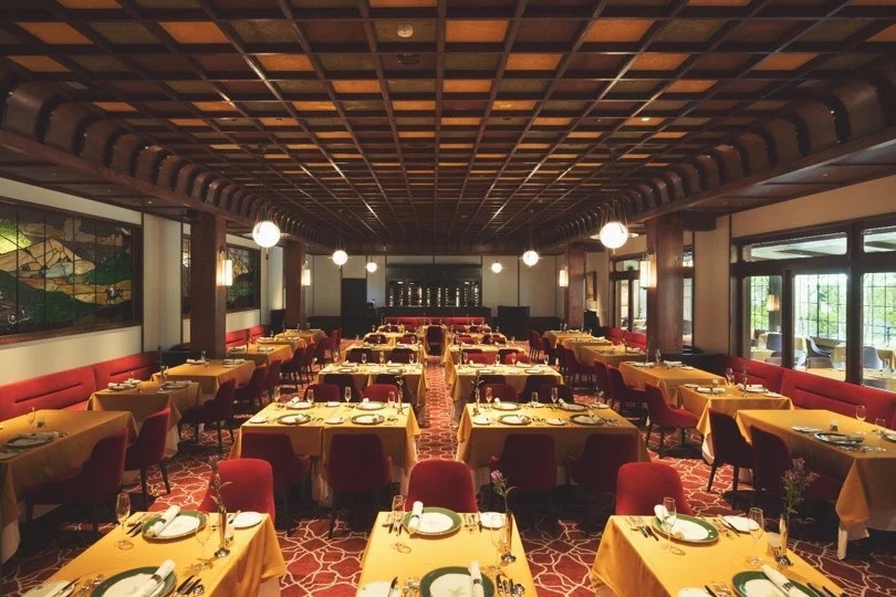 創業以来、多くのお客様をおもてなししてきたメインダイニングルーム。同ダイニングの象徴として愛されてきた大きなステンドグラスや格天井のモチーフはそのままに、より明るく開放的なダイニングへ生まれ変わった。