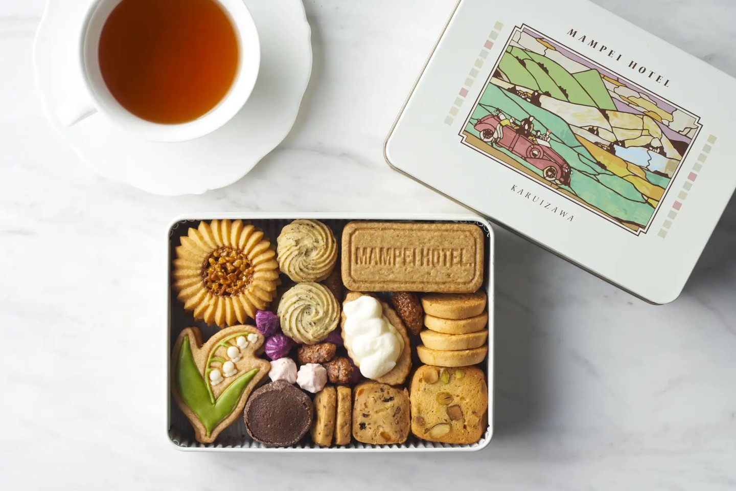 ホテル伝統のアップルパイをはじめ、同ホテルならではのオリジナルアイテムを揃える「ショップ」。ソフトオープンを記念した新アイテム「万平ホテルプレミアムクッキー缶」や、出来たての味わいをお楽しみいただける「万平ホテル ベーカリーコレクション」のほか、お土産にぴったりのパウンドケーキやスイーツ、ステーショナリーなどが並ぶ。