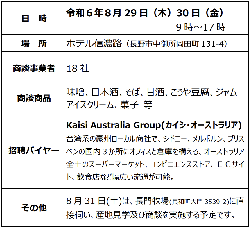 日本食材の需要拡大が見込まれ、有望な市場であるオーストラリアの食品バイヤーを招へいし、長野市内で個別商談会を開催する。商談が成立した商品はオーストラリアへ輸出され、豪の小売店やECサイトで販売される他、2月にシドニー市内で開催する県産品フェアでも販売する予定だ。