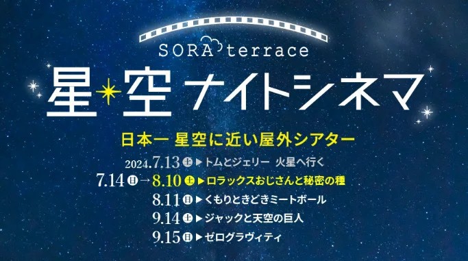 2024年9月14日(土)、15日(日)に屋外シアターイベント「星空ナイトシネマ」を開催。「星•宇宙•自然」に関連のある洋画、2作品を無料※5で上映する。上映会場の特設スクリーンは標高1,770mの山頂エリアに設置し、「日本一星空に近い屋外シアター」で映画をお楽しみいただける。また、会場には景色や映画を楽しむために設置されたクラウドライン(屋外ベンチ)もあり、満天の星を眺めながらの映画鑑賞は、夏の旅行にオススメだ。