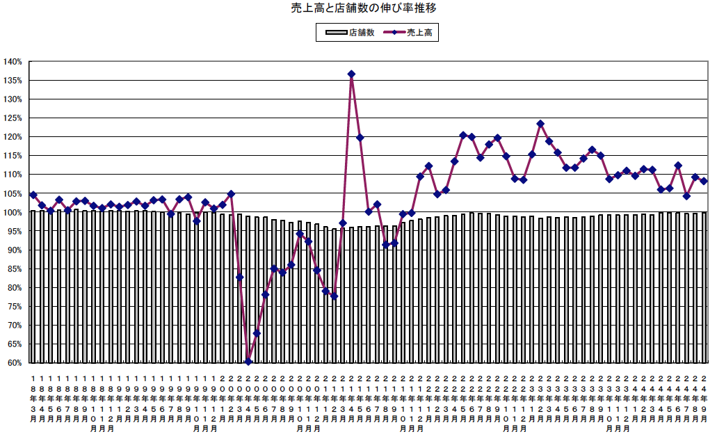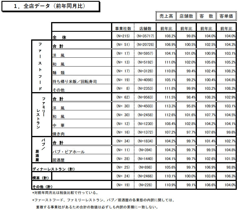 全体概況では9月は2度の三連休と日曜が1日多い曜日周りで、客足は堅調に推移した。また9月までの累計訪日外客数が昨年1年間を既に上回り、売上増に寄与した。天候面では全国的に残暑が厳しく、各地で9月の観測史上最高の気温を記録し、冷たいドリンク類などが売れた。加えて季節定番メニューも堅調な売れ行きを見せ、外食全体の売上げは前年比108.2%となった。