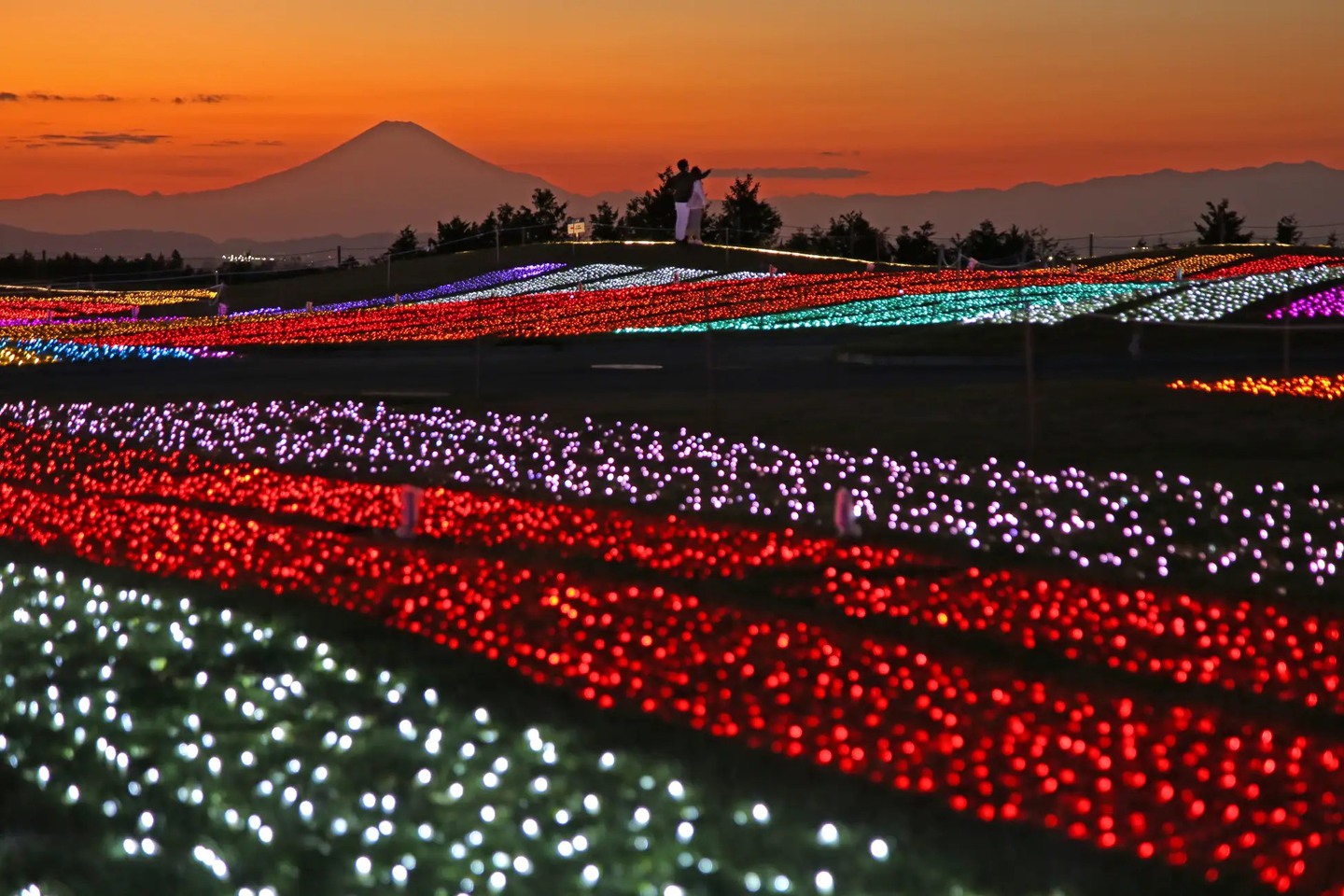 標高約300mの山頂に位置し東京湾を望む立地のマザー牧場だから見ることができる、景色とイルミのコラボレーションが特徴だ。夕方は夕陽に輝くオレンジの景色。日没後~40分間のマジックアワーでは空のグラデーションが美しい景色。夜は東京湾の夜景を一望するロマンチックな景色。時間と共に移り変わる景色と色鮮やかなイルミネーションとのコラボレーションをゆっくりとお楽しみ下さい。天気が良ければ、富士山のシルエットの浮かぶ夕景をご覧いただくことが出来る。