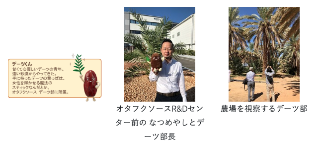 同社では2019年10月1日から、日本で唯一の部署「デーツ部」を創設した。現在3名が所属し原料調達から商品開発、営業活動まで幅広く活動している。さらにデーツ部PR担当としてデーツくんが、デーツの普及活動に日々奮闘している。