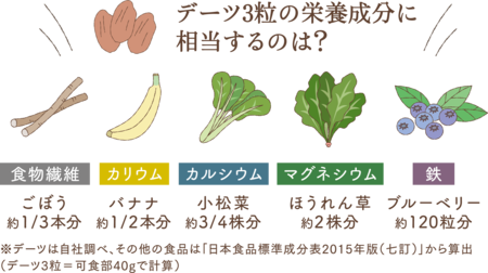 デーツ一粒にはさまざまな栄養素が含まれている。とりわけ多く含まれるのは食物繊維とカリウム。その他にもカルシウム、マグネシウム、鉄などのミネラルが含まれている。