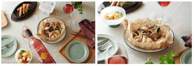 レシピ②「味 噌󠄀を絡める きのこの紙包み蒸し」と『日本の新酒 マスカット・ベーリーA ロゼ 2022』のマリアージュ