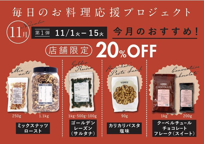 第1弾は11月1日(火)から15日(火)、第2弾を11月16日(水)から30日(水)まで開催。対象の商品を20%OFFとお買い求めいただきやすい価格設定にしている。本プロジェクトは来年以降まで継続的に実施をしていく。「お料理に使える材料系の商品やそのまま召し上がっていただけるスナック類の商品など様々に展開予定で、是非この機会に気軽にご家庭での料理を楽しんでいただければと思います」と話している。