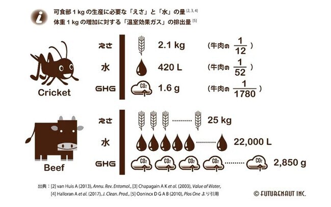 食用昆虫の中でも、同社は特に「クリケット(食用コオロギ)」の可能性に着目している。その最も大きな理由が、『環境にやさしいたんぱく源』であること。生産に必要な餌や水が少なく、温室効果ガスの排出量もわずかであることが大きなメリットだ。さらにクリケットは雑食性であるため、まだ食べられるのに捨てられてしまう「食品ロス」や、人の食料と競合しない「非可食資源」を餌に利用することができ、循環型のフードサイクルを実現することも可能だ。