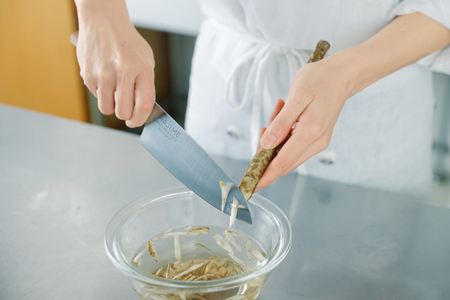 ナチュラルなテイストの持ち手が印象的なHAJIMEの包丁。持ち手は細身で小さな手にもなじみやすい流線形のデザインで、きゅっとにぎりやすくて使いやすい、独特の形状にこわった。
