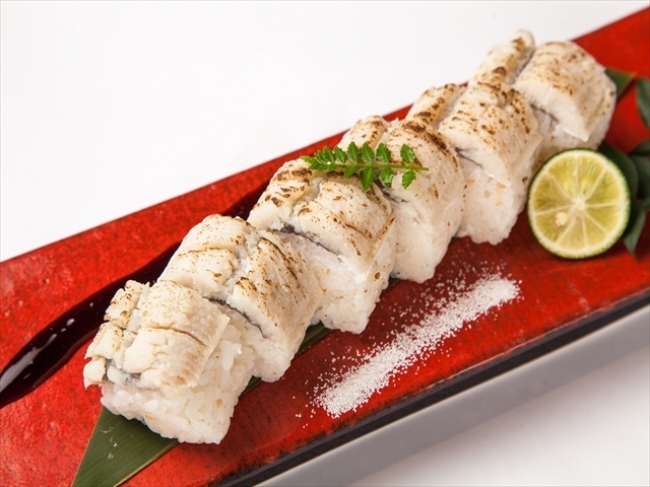 京都では甘辛く炊いたものを棒寿司にするが、「隠れ房」ではじっくりと蒸しあげたものを棒寿司にしてシンプルな味わいでお楽しみいただける。 お好みで藻塩•酢橘•つめでお召し上がりください。