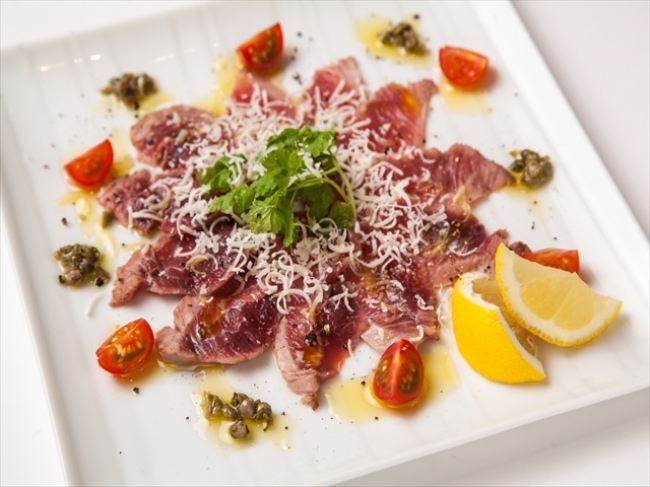 肉のような食べごたえのある食感のほほ肉を、軽く湯引きにし、オリーブオイルでさっぱりとカルパッチョに仕立てた。 日本酒はもちろん、辛口のワインに合せても◎!