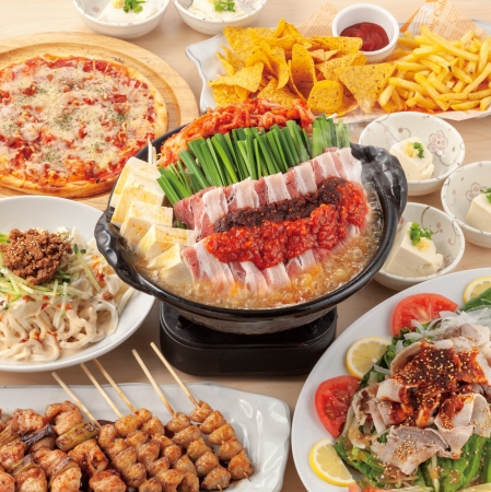 うま辛キムチチゲ鍋/夏野菜と豚しゃぶの香味サラダ/〆の胡麻坦坦うどん/寄せ豆腐/ドリトス&ポテト/ベーコンピザ/ねぎま&ぼんちり串盛合わせ(タレ)