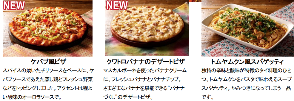 販売商品:フェア期間中に登場する商品はピザ 2 種とパスタ1種