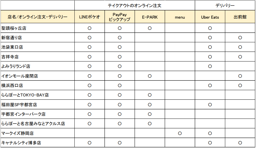※「オンライン注文」「デリバリー」は下記の13店舗で実施している。※2021年2月26日時点