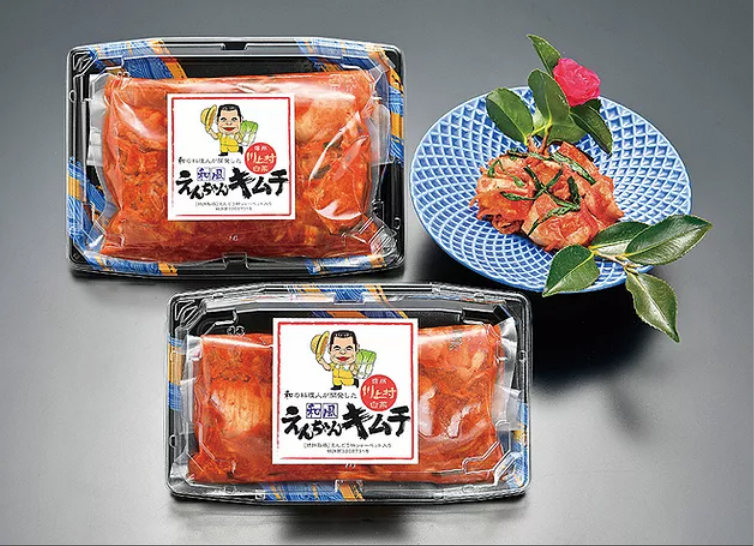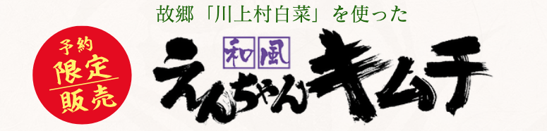 私の故郷・川上村の白菜をていねいに 漬け込んだ「えんちゃんキムチ」です。標高1300mの高原で育った肉厚でやわらかく深い甘みを持つ白菜に、特許取得の「えんどう柿シャーベット」や厳選した7種類の唐辛子をはじめ27種類の隠し味を加え、渾身の思いで仕上げました。深いうまみはもちろん 乳酸菌発酵の免疫パワーも注目され、毎冬、料亭のお客様に喜ばれております。ただ手がかかって量産できないためここ数年は店舗でお召し上がりいただくだけでした。しかしながら、この冬は特別に再販を決意。ご自宅の食卓で、この味、このパワーを健康対策にお役立ていただければ幸いです。