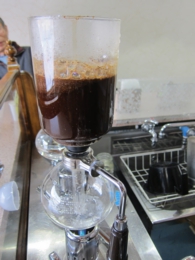 珈琲を淹れる女性スタッフは売店と兼用で対応している。それにしても丁寧な応対と小気味良い会話は癒される。コーヒーサイフォンは「ドリップ式」と並んで良く知られたコーヒーの抽出方法だが、個人的には香りが強く出るドリップコーヒーを好んでいる。