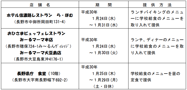 全国学校給食週間(1/24~1/30)に合わせて、現在学校給食で出されている子どもたちに人気のメニューを長野市内飲食店で召し上がれる。「この機会に是非ご賞味ください」と関係者が呼び掛けている。