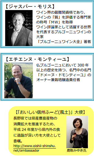 ワイン業界で最も名声の高い「マスター•オブ•ワイン(MW)」の資格をもつジャスパー•モリス氏と、ブルゴーニュトップドメーヌのオーナー兼栽培醸造責任者であるエチエンヌ•モンティーユ氏が、NAGANO WINEの調査のため「おいしい信州ふーど(風土)」大使の鹿取みゆき氏とともに県内のワイナリーを視察し、試飲•評価をする。