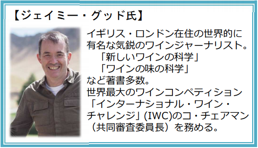 ジェイミー•グッド氏はイギリス・ロンドン在住の世界的に有名な気鋭のワインジャーナリストだ。「新しいワインの科学」「ワインの味の科学」 など著書多数。世界最大のワインコンペティション「インターナショナル•ワイン•チャレンジ」(IWC)のコ•チェアマン(共同審査委員⻑)を務める。