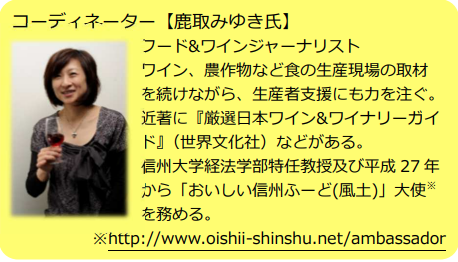 一方、コーディネーターの鹿取みゆき氏(フード&ワインジャーナリスト)は、ワイン、農作物など食の生産現場の取材を続けながら、生産者支援にも力を注ぐ。近著に『厳選日本ワイン&ワイナリーガイド』(世界文化社)などがある。信州大学経法学部特任教授及び平成27年から「おいしい信州ふーど(風土)」大使を務める(http://www.oishii-shinshu.net/ambassador)。