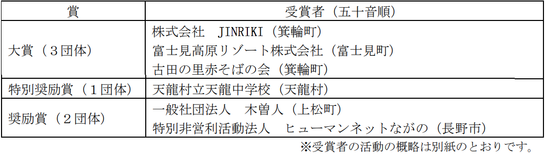 第5回信州おもてなし大賞表彰式は3月20日(火)13:30~14:00、場所はホテルメトロポリタン長野3階「浅間」で行われる。内容は知事あいさつ、賞状授与、受賞団体代表者あいさつ、記念撮影となっている。